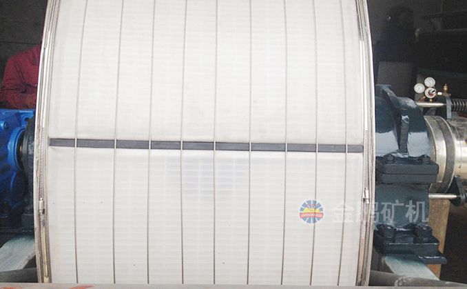 整個筒體外面裹著濾布,為了保證每室之間的密封,濾布用膠條、麻繩或棕繩嵌在隔條的繩槽內(nèi)。然后再用繞線機構(gòu)在筒體外面沿軸向以50-80mm的間距纏繞很多道鋼絲,把濾布固定在筒體上。
