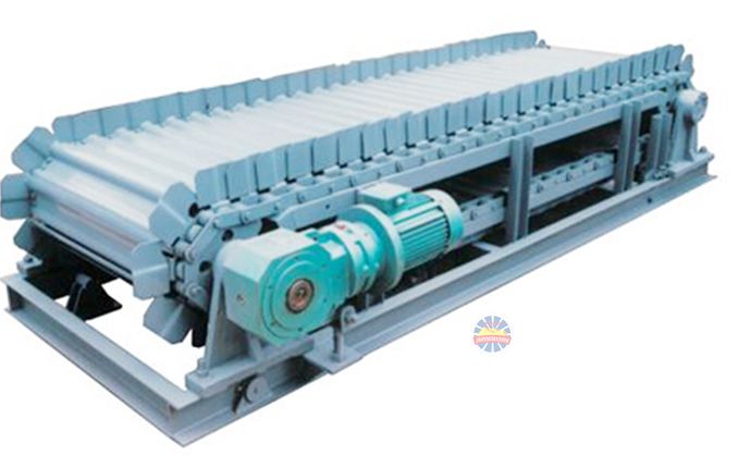 采用節距為150mm的高強度模鍛鏈條為牽引件,兩根鏈條繞過安裝在機體頭部的一對驅動鏈輪和機體尾部的一對張緊輪聯成封閉形回路,在兩排鏈條的每個鏈節上裝配了相互交迭的、輕型結構的輸送槽而成為一個連續的能夠運載物料的輸送線路。其自重和物料的重量由安裝在機體上的多排支重輪、鏈托輪和滑道梁支承。傳動系統經交流變頻調速電動機聯接減速機,再由漲套與驅動裝置直聯驅動運載機構低速運行。將尾部料倉卸入的物料沿輸送線路運至機體的前方排出,實現向下方的工作機械連續均勻喂料的目的。