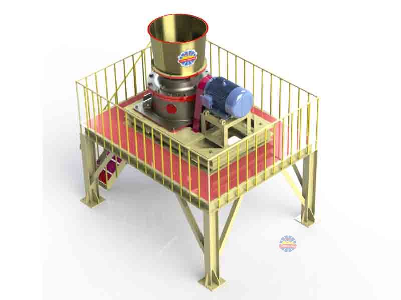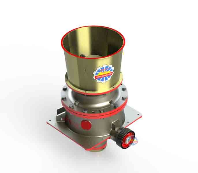 PYY圓錐破碎機(jī)工作時(shí):電機(jī)帶動(dòng)破碎機(jī)的小齒輪,小齒輪帶動(dòng)大齒輪,大齒輪組件(大齒輪、大齒輪架、偏心鋼套)帶動(dòng)偏心套組件(偏心缸套、偏心銅套)和主軸組件(主軸、內(nèi)錐、內(nèi)錐襯板)以理論垂直線為中心,在銅襯套內(nèi)公轉(zhuǎn),主軸組件在偏心銅套內(nèi)以主軸的中心線可以實(shí)現(xiàn)自轉(zhuǎn)??諜C(jī)運(yùn)行的時(shí)候,偏心套組件“抱著”主軸組件和隨大齒輪一同公轉(zhuǎn),當(dāng)物料加入到破碎腔后,主軸總成(主軸、內(nèi)錐)在物料的阻力下在偏心銅套內(nèi)緩慢的自轉(zhuǎn)。內(nèi)錐的運(yùn)行軌跡看起來(lái)是在破碎腔內(nèi)來(lái)回?cái)[動(dòng),同時(shí)緩慢的旋轉(zhuǎn)。物料被擺動(dòng)的內(nèi)錐擠壓破碎。支撐套與架體連接處靠液壓缸壓緊,當(dāng)破碎機(jī)內(nèi)落入金屬塊等不可破碎物體時(shí),單缸的動(dòng)錐由底部液壓活塞托起,起到排放口調(diào)整和過(guò)鐵保護(hù)、反復(fù)起落排除堵礦的作用。